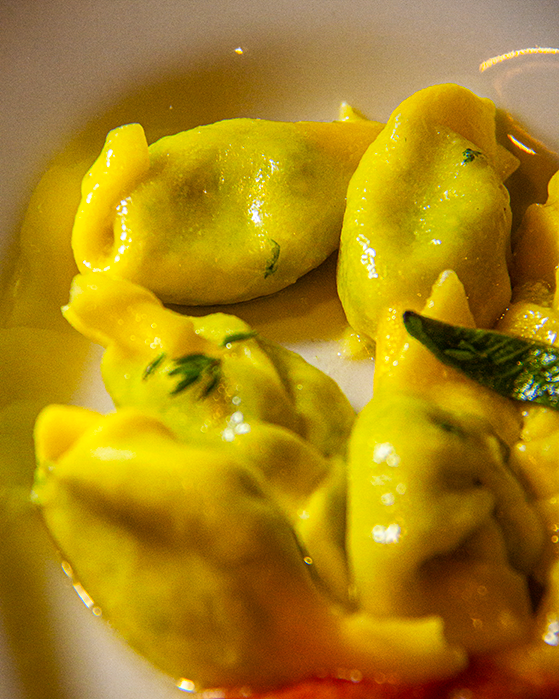 – Bis di primi: tortelli ricotta e spinaci saltati burro e salvia e pisarei e faso (gnocchetti di pane con fagioli e pomodoro);