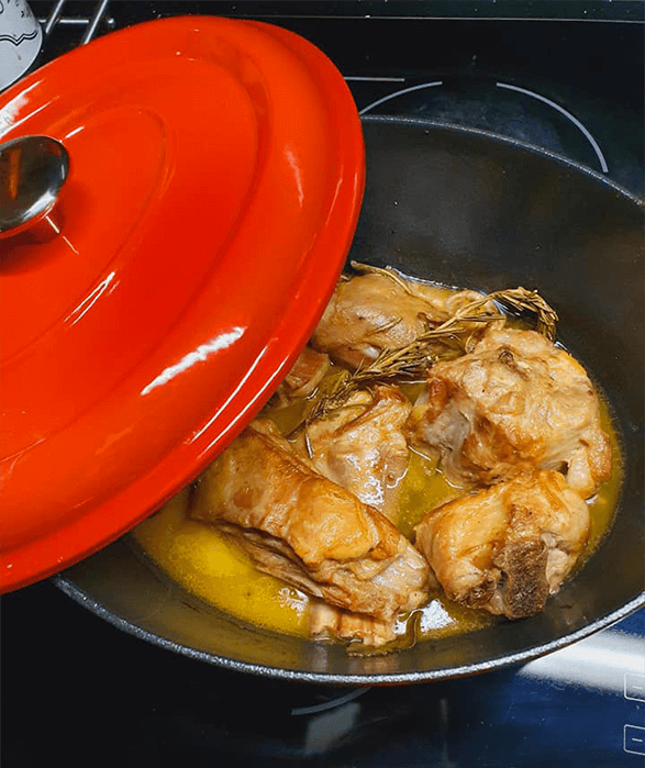 - Rimettete i pezzi in pentola e aggiungete l'alloro, i chiodi di garofano e il pepe, un filo scarso di olio (giusto per non fare attaccare), chiudete con il coperchio e mettete nel forno già caldo statico a 190°C per 20 minuti a cuocere.