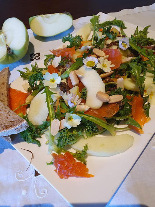 Oggi vi proponiamo un’insalata ricca. Si parte dal leontodo, ma aggiungiamo anche frutta secca, legumi, fiori e salmone. Un tripudio di sapori insomma! Buon appetito!