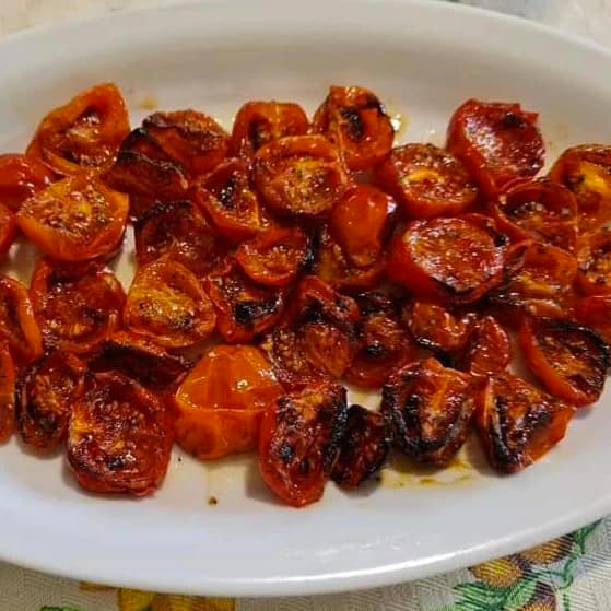 - Posizionare i pomodori verso l’alto in friggitrice ad aria e cuocere 20 minuti a 180°, se non vi sembrano abbastanza coloriti date 5 minuti di cottura in più. Se utilizzate il forno ci vorrà almeno il triplo del tempo