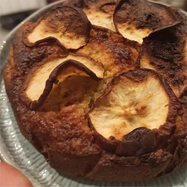 - Versa in uno stampo da 12 cm (Per uno stampo grande triplica le dosi) e decora fettine della mela restante e pezzetti di noci a piacere